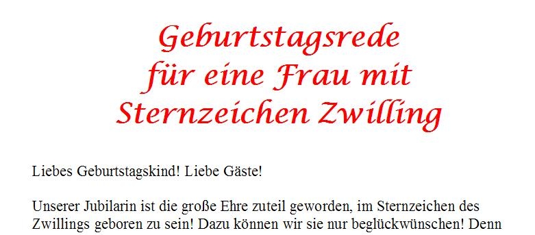 Die kurzweilige Rede nimmt Bezug auf das Sternzeichen Zwilling und kann Beginn oder Höhepunkt der Geburtstagsfeier sein